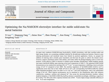 Na超离子导体(NASICON)虽然具有良好的安全性和较高的离子电导率,但其烧结性能差及界面相容性差,针对这一问题,团队提出添加复合烧结助剂来致密化晶界,并微调晶粒,以实现致密的微观结构,并改善与钠负极界面接触。该研究工作于2024年4月在Journal of Alloys and Compounds (IF: 6.2)上发表。(https://doi.org/ 10.1016/j.jallcom.2024.174529)