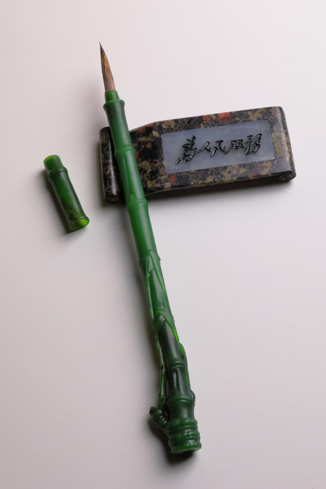 黄雄教授的《中国竹.写春秋》玉雕作品,精选上等和田碧玉材料,通过精心设计、细心雕刻,巧妙制作出精美绝伦、惟妙惟肖的青竹杆毛笔和镌刻有“为人民服务”题词的笔托,通过艺术加工、视觉化表达,独具匠心地呈现出一代伟人毛泽东虚心、坚韧的高洁人格和以人为本、人民至上的博大情怀。