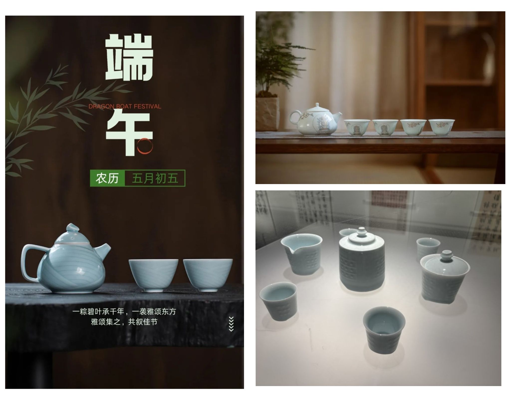 陈叶蕾副教授团队联合武汉理工大学龚余辉教授团队设计研发的非遗瓷器之《楚歌》《端午》《黄鹤楼》系列,将曾侯乙编钟、端午节的传说、黄鹤楼等楚文化中最具代表性的设计灵感,通过符号化、可视化的艺术形态融入瓷器创作,制作出别具情怀的精品茶器,让人在悠然品茗之余,通过视觉、嗅觉、味觉等全方位感受荆楚文化的无穷魅力。