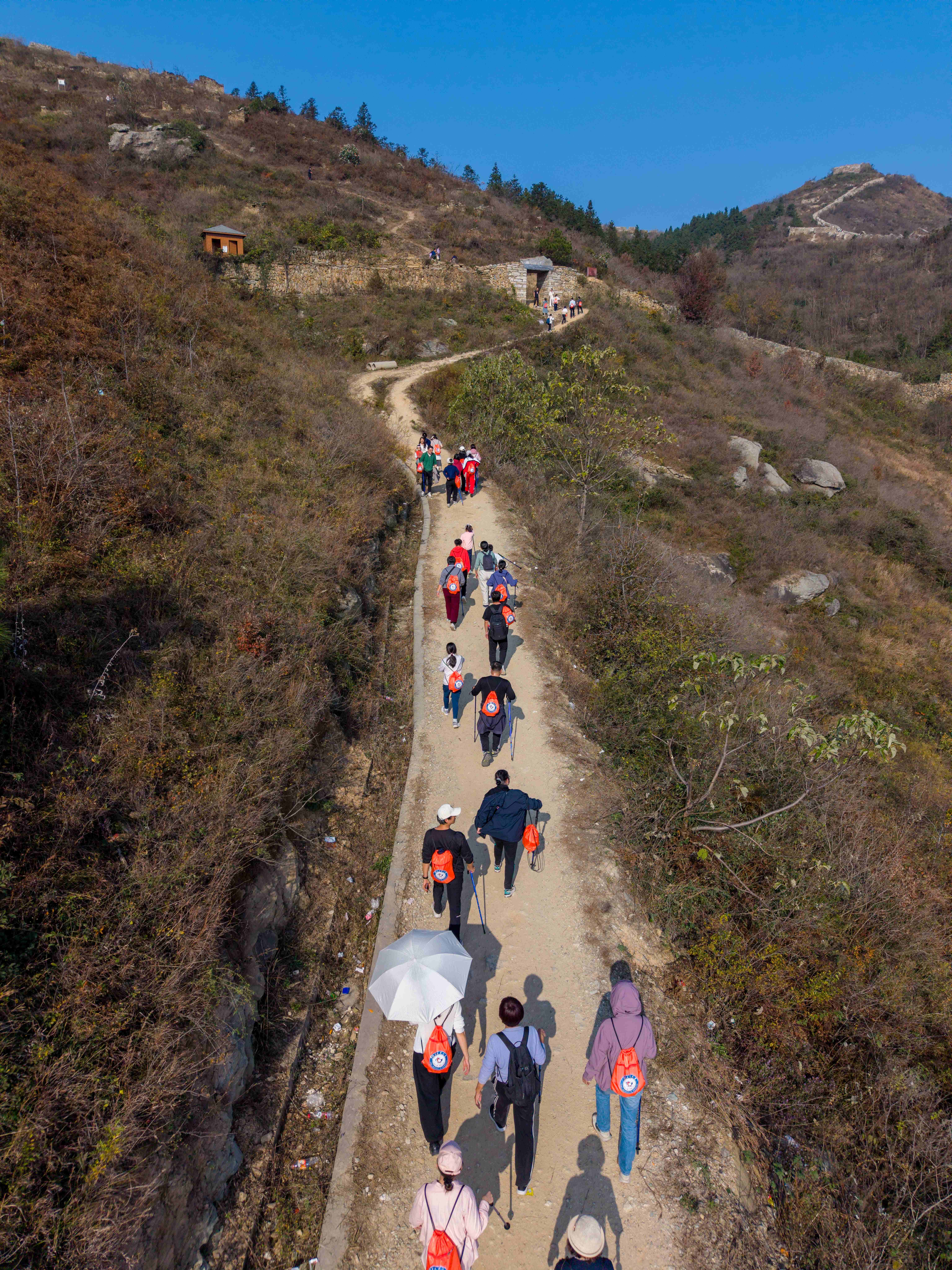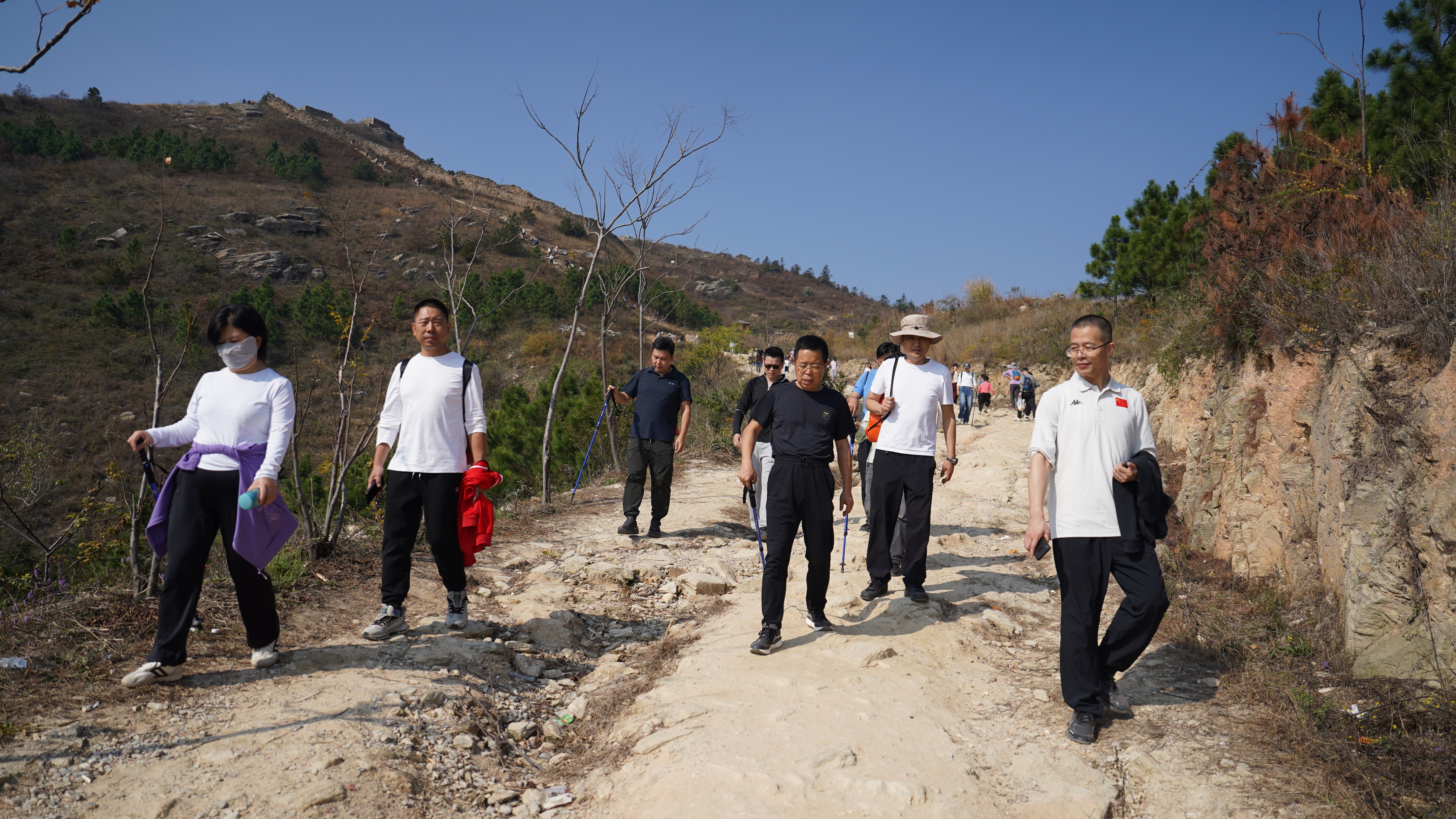 本次徒步地点位于武汉市黄陂区李集街驻程岗村耳门李湾以北的龙王尖古寨遗址,这里是大别山余脉。初冬时节,晴空万里,金黄的草甸与连绵的山峦、古老的石寨交相辉映。师生们远离城市喧嚣,在相互交流、携手攀登中,增进了解、挑战自我,一起欣赏自然美景、共同感受巍巍壮观的历史遗迹,一路欢声笑语、神采飞扬,气氛融洽。