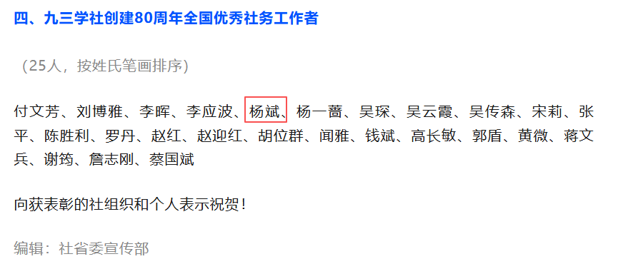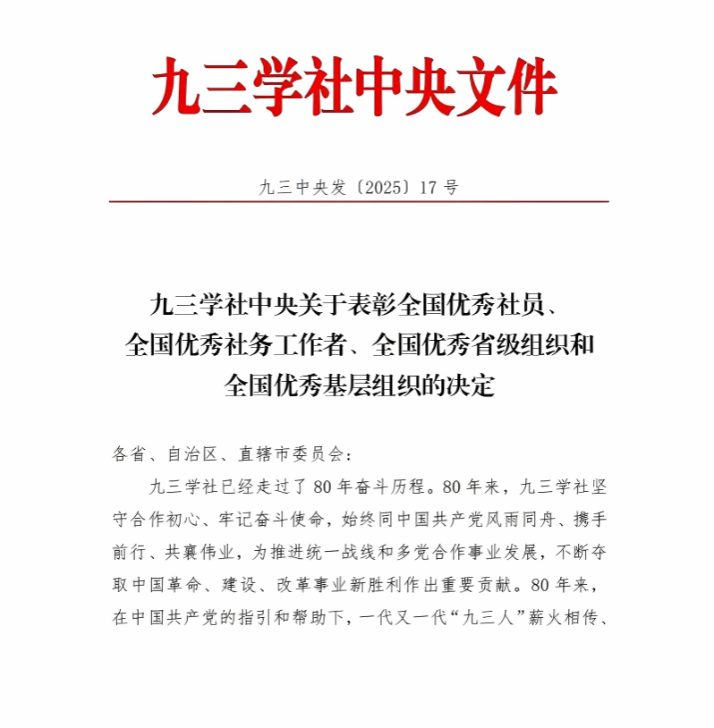 近日,九三学社中央印发《九三学社中央关于表彰全国优秀社员、全国优秀社务工作者、全国优秀省级组织和全国优秀基层组织的决定》(九三中央发〔2025〕17号),对在工作中作出突出成绩的省级组织、基层组织、社员和社务工作者进行了评选表彰。我校九三学社支社主委杨斌荣获九三学社创建80周年全国优秀社务工作者。